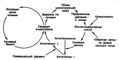Рис. 325-5. Взаимосвязь объемной и калиевой петель обратной связи в их действии на секрецию альдостерона. Уровень секреции альдостерона определяется интеграцией сигналов из каждой петли. 20 мин). Ткани других органов, таких как матка, сосуды, мозг и слюнные железы, также вырабатывают рениноподобные соединения. Значение этих так называемых изоренинов неизвестно. Секреция ренина контролируется четырьмя независимыми факторами, и количество выделяющегося ренина — это результативное действие всех их. Юкстагломерулярные клетки, представляющие собой специализированные миоэпителиальные клетки, расположенные в средней оболочке стенки, приносящей артериолы, выступают в роли миниатюрных датчиков, воспринимающих почечное перфузионное давление и соответствующие изменения перфузионного давления в приносящих артериолах. Например, в условиях снижения объема циркулирующей крови происходит соответствующее снижение перфузионного давления в почках и, как следствие, давления в приносящих артериолах (см. рис. 325-5). Юкстагломерулярные клетки воспринимают это как уменьшение силы растяжения стенок приносящих артериол. В ответ эти клетки выделяют в почечный кровоток большие количества ренина, что приводит к образованию ангиотензина I, который в почках и периферических тканях превращается в ангиотензин II под действием пептидилпептидгидролазы (так называемого превращающего фермента). Ангиотензин II стимулирует кору надпочечников к секреции альдостерона. Повышенный уровень альдостерона в плазме крови приводит к увеличению задержки натрия в почках и тем самым обусловливает повышение объема внеклеточной жидкости. Это в свою очередь снимает первоначальный сигнал к высвобождению ренина. В данном контексте система ренин—ангиотензин—альдостерон обеспечивает регуляцию объема жидкости путем адекватного изменения транспорта натрия в почечных канальцах. Второй механизм регуляции секреции ренина сосредоточен в клетках плотного пятна — группе эпителиальных клеток дистальных извитых канальцев, расположенных напротив юкстагломерулярных клеток. Они способны выполнять функцию хеморецепторов, следящих за уровнем натрия (или хлорида) в дистальных канальцах и передающих эту информацию юкстагломерулярным клеткам, где и происходит нужная модификация секреции ренина. В условиях поступления к плотному пятну повышенного количества фильтруемого натрия обратная связь в юкстагломерулярном комплексе замыкается, что приводит к высвобождению больших количеств ренина, способных уменьшить скорость клубочковой фильтрации и тем самым снизить фильтруемое количество натрия. Симпатическая нервная система регулирует высвобождение ренина в ответ на переход тела в вертикальное положение. Механизм эффекта заключается либо в непосредственной активации аденилатциклазы в юкстагломерулярных клетках, либо в опосредованном действии на эти клетки или клетки плотного пятна через сужение приносящих артериол. Наконец, на высвобождение ренина могут влиять и факторы, содержащиеся в крови. Увеличение калия в диете прямо снижает секрецию ренина; уменьшение потребления калия повышает секрецию ренина. Значение этих эффектов калия остается неясным. Сам по себе ангиотензин II может по механизму обратной связи тормозить секрецию ренина независимо от измене