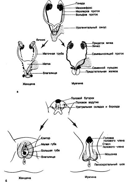 На первом этапе половой дифференцировки устанавливается хромосомный пол: пол гетерогаметы (XY) — мужской, а гомогаметы (XX) — женский. Затем примерно до 40-го дня беременности эмбрионы обоего пола развиваются одинаково. Вторая стадия половой дифференцировки заключается в превращении недифференцированных гонад в яички или яичники. Дифференцировка гонад в яички опосредуется генами Y-хромосомы, один из которых либо идентичен гену, кодирующему HY-антиген, либо тесно сцеплен с ним. Завершающий процесс — трансляция гонадного пола в фенотипический пол — зависит от типа образовавшихся гонад плода и их эндокринной секреции. Развитие фенотипического пола приводит к (формированию мужского и женского мочеполового аппарата. Внутренние половые органы образуются из вольфовых и мюллеровых протоков, которые на ранних стадиях эмбрионального развития обоих полов расположены рядом (рис. 333-1, а). У зародышей мужского пола вольфовы протоки дают начало придаткам яичка, ссмявыносящим протокам и семенным пузырькам, а мюллеровы протоки исчезают. У эмбрионов женского пола из мюллеровых протоков развиваются маточные трубы, матка и верхняя часть влагалища, а вольфовы протоки регрессируют. Наружные гениталии и уретра у плодов обоего пола развиваются из общей закладки — урогенитального синуса и полового бугорка, складок и вздутий (рис. 333-1, б). Урогенитальный синус у плода мужского пола дает начало предстательной железе и простатической части уретры, а у плода женского пола—уретре и части влагалища. Из полового бугорка образуется головка полового члена у плодов мужского пола и клитор у плодов женского пола. Урогенитальные вздутия превращаются в мошонку или большие половые губы, а половые складки — в малые половые губы или сливаются, образуя мужскую уретру и ствол полового члена. Если яички отсутствуют, как, например, у нормальных эмбрионов женского пола или у мужских зародышей, кастрированных до начала фенотипической дифференцировки, развитие фенотипического пола происходит по женскому направлению. Таким образом. маскулинизация плода—это положительный результат действия гормонов эмбриональных половых желез, тогда как развитие по женскому типу не требует присутствия гонад. Половой фенотип в норме соответствует хромосомному полу. Иными словами, хромосомный пол определяет гонадный пол, а гонадный пол в свою очередь контролирует фенотипический пол.