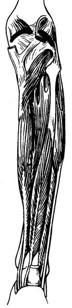Передняя большеберцовая мышца (m. tibialis anterior) Начало: Латеральный мыщелок, латеральная поверхность большеберцовой кости, межкостная перепонка голени Прикрепление: Медиальная клиновидная кость, основание I плюсневой кости Функция: Разгибает и супинирует стопу, при фиксированной стопе наклоняет голень вперед Длинный разгибатель пальцев (m. extensor digitorum longus) Начало: Латеральный мыщелок большеберцовой кости, медиальная поверхность малоберцовой кости, межкостная перепонка голени Прикрепление: Сухожильное растяжение тыла II—V пальцев Функция: Разгибает II—V пальцы и стопу Длинный разгибатель большого пальца стопы (m. extensor hallucis longus) Начало: Медиальная поверхность малоберцовой кости, межкостная перепонка голени Прикрепление: Сухожильное растяжение тыла большого пальца стопы Функция: Разгибает большой палец стопы и стопу 3. Латеральная группа мышц голени Длинная малоберцовая мышца (m. peroneus longus) Начало: Головка и латеральная поверхность малоберцовой кости, латеральный мыщелок большеберцовой кости Прикрепление: Подошвенная поверхность медиальной клиновидной кости, I — II плюсневых костей Функция: Сгибает стопу, поднимает ее латеральный край, укрепляет поперечный свод стопы Короткая малоберцовая мышца (m. peroneus brevis) Начало: Латеральная поверхность малоберцовой кости Прикрепление: Бугристость V плюсневой кости Функция: Сгибает стопу, поднимает ее латеральный край
