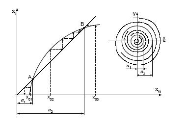 На рис. 2.17,б приведена фазовая траектория системы для начальных условий (x0, 0) в случае ее устойчивости в линейной области. Метод точечных преобразований (метод Пуанкаре-Андронова) позволяет установить существование автоколебаний в нелинейной системе второго порядка без построения фазовых траекторий [10]. Сущность метода заключается в том, что для исследования динамики системы необходимо выяснить, как в зависимости от начальных условий перемещаются точки пересечения фазовой траектории с некоторой полупрямой, например, отрезком 0X фазовой плоскости (рис. 2.18).
