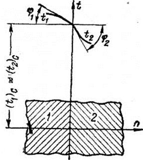 В задачах с граничным условием четвертого рода задается отношение тангенсов угла наклона касательных к температурным кривым в точке соприкосновения тел или тела и среды (рисунок 1.4)