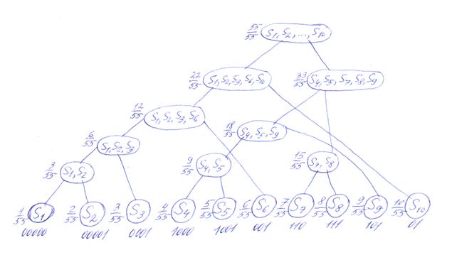 Рис.1.5 Кодовое дерево в процедуре Шеннона-Фано