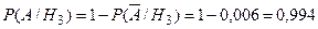 Пример 14. Партия электрических лампочек на 20% изготовлена первым заводом, на 30% - вторым, на 50% - третьим. Вероятность выпуска бракованных лампочек соответственно равны: q] = 0,01, q2 = 0,005, q3 = 0,006. Найти вероятность того, что наудачу взятая из партии лампочка окажется стандартной. Решение. Введем обозначения: А - событие, состоящее в том, что «из партии взята стандартная лампочка», H1 - событие, состоящее в том, что «взятая лампочка изготовлена первым заводом», Н2 - событие, состоящее в том, что «взятая лампочка изготовлена вторым заводом», Н3 - событие, состоящее в том, что взятая лампочка изготовлена «третьим заводом». Найдем условные вероятности Р(А/Нi), (i = 1,2,3) по формуле Р(А/Нi) = 1 -Р(