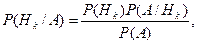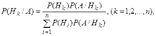 Пусть H1, H2,..., Hn - попарно-несовместные события, вероятность которых P(Hi)≠ 0, (i = 1,2,..., п) и событие АÌ H1 + H2 +... + Нп, для которого известны условные вероятности Р(А/Нk), (i = 1,2,..., п). Произведен опыт, в результате которого появилось событие А. Условные вероятности событий H1, H2,..., Hn относительно события А определяются формулами