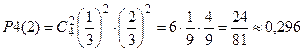 Пример 17. Частица находится на прямой в начале координат. Под действием случайных толчков частица каждую секунду Решение. Через 4 секунды частица вернется в начало координат в том случае, если она переместится ровно два раза вправо (и, значит, два раза влево). По формуле Бернулли найдем вероятность того, что из четырех независимых перемещений частицы ровно два перемещения будут вправо:
