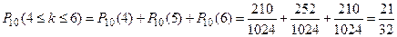 Пример 20. Монета подброшена 10 раз. Найти вероятность того, что герб выпадет: а) от 4 до 6 раз; б) хотя бы один раз. Решение. Пусть А - событие, состоящее в том, что выпадет герб. По условию задачи имеем: n =10, k1 =4, k2 =6, p=q=0,5. Находим а)
