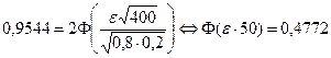 Значение функции φ(х) возьмем из таблицы. Находим: п = 200, npq = 200 · 0,75 · 0,25 = 150 · 0,25 = 0,375. т = к = пр = 150 р = 0,75 q = 0,25. Получим: Пример 22. В партии из 400 деталей 80% - стандартных. Найти границы, в которых с вероятностью 0,9544 заключена доля стандартных деталей. Решение. Воспользуемся формулой, являющейся частным случаем формулы Муавра-Лапласа