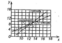 Таким образом, прямая регрессии Y на X имеет уравнение y =-5,705+1,103 x. Аналогично находим Отсюда прямая регрессии X на Y имеет уравнение х = 7,637 + 0,599 у. Проверка показывает