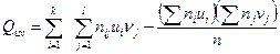 9.9. Корреляционная таблица . Двумерную выборку большого объема представляют в виде корреляционной таблицы. С этой целью группируют реализации величин X и Y по интервалам длины bх и by, а в клетки таблицы записывают число пар исходной выборки (т. е. частоты) для каждой комбинации интервалов. Эту процедуру можно также выполнить непосредственно по диаграмме рассеивания, нанося на нее сетку горизонтальных и вертикальных прямых, взятых с постоянными шагами bх и by. Наблюдения, которые попали на верхнюю и правую границы рассматриваемого прямоугольника, относятся соответственно к соседним верхнему и правому прямоугольникам. В дальнейших вычислениях используются середины интервалов и соответствующие частоты. Обозначим середины интервалов через Полагаем Для упрощения вычислений вместо середин интервалов Определение выборочных числовых характеристик распределения по корреляционной таблице выполняется в следующей последовательности. Сначала вычисляют суммы