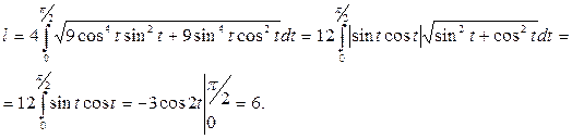 Пример 4.2.8. Вычислить длину астроиды у = sin3t, х = cos3t. Решение. Астроида - замкнутая линия, при обходе которой параметр t меняется от 0 до 2π. Так как кривая симметрична относительно осей координат, достаточно вычислить длину ее дуги, лежащей в первом квадранте. Поэтому
