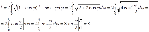 Пример 4.2.9. Вычислить длину дуги кардиоиды ρ = 1 + cosφ. В силу симметрии кардиоиды относительно оси ОХ достаточно вычислить длину дуги ее верхней половины, для которой φє[0,π]. Тогда