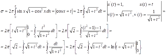 Пример 4.2.10. Вычислить площадь поверхности, образованной вращением первой арки синусоиды у = sin х, хє[0,π] вокруг оси ОХ. Решение. Согласно приведенной выше формуле