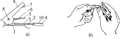 Рис. 10.4. Механический инструмент для скола ОВ: а - общий вид; б - процесс скола.
