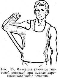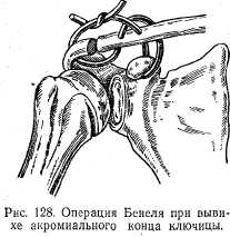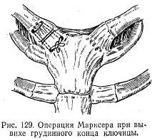 Лечение. Вправляют вывихнутый конец ключицы. На ключицу накладывают плотный картонный пелот и фиксируют гипсовой повязкой (рис. 127). В ряде случаев эта методика может оказаться весьма эффективной, особенно при вывихе акромиального конца ключицы. В тех же случаях, когда невозможно удержать вывихнутый конец ключицы, прибегают к оперативному лечению. Сущность операции заключается при вывихе акромиального конца ключицы в фиксации его к акромиальному концу лопатки и при вывихе грудинного конца ключицы к грудине. Фиксацию производят лавсановой нитью, бронзово-алюминиевой проволокой или стальной спицей. При вывихе акромиального конца ключицы хороший результат дает операция Беннэля: ключицу фиксируют к акромиону и клювовидному отростку лопатки при помощи шелковой нити или полоской широкой фасции бедра (рис. 128). При вывихе грудинного конца ключицы чаще производят операцию Марксера (рис. 129). Переломы ключицы. Возникают в результате прямого удара или при падении на вытянутую руку, локоть, боковую поверхность плеча. У детей чаще наблюдается поднадкостничный перелом без значительного смещения костных отломков. У взрослых отмечаются поперечные, косые и оскольчатые переломы. Как правило, переломы сопровождаются смещением костных отломков. Центральный костный отломок за счет тяги грудинно-ключично-сосцевидной мышцы смещается кверху и кзади, периферический за счет тяги подключичной мышцы — книзу и кнутри. Костные отломки могут повредить сосудисто-нервный пучок, купол плевры или кожу (открытый перелом).