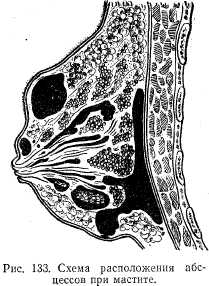 Мастит Под маститом понимают воспаление молочной железы. Наиболее часто мастит возникает у первородящих. Причиной является трещина соска, через которую проникает инфекция (стафилококк). Клиническая картина зависит от стадии заболевания. В серозной стадии — молочная железа увеличена в размерах, уплотнена, болезненна. Наблюдается подъем температуры до 39°С. В инфильтративной стадии в молочной железе происходит образование одного или нескольких плотных инфильтратов без четких границ. Кожа над ними краснеет, боль более значительная, температура в пределах 40°С. Лейкоцитоз — 10 000—12 000. Абсцедирующая стадия характеризуется развитием клинической картины, в области инфильтратов появляется флюктуация. Во флегмонозной стадии в процесс вовлекается почти вся молочная железа, развивается септическое состояние (высокая температура, озноб, сухость языка, бессонница, головная боль, потеря аппетита, лейкоцитоз до 17000—20 000, СОЭ до 60— 70 мм/г). Гангренозная стадия наступает вследствие нарушения кровообращения за счет тромбоза кровеносных сосудов. Молочная железа становится мягкой, дряблой. Состояние септическое. Хроническая инфильтративная стадия чаще всего наблюдается при неправильном лечении. Температура субфебрильная, общее состояние удовлетворительное, в молочной железе пальпируется плотный, хрящевой консистенции инфильтрат (рис. 133). Профилактика. Необходимо предупреждать застой молока и трещины сосков. С этой целью, если ребенок не может полностью отсосать молоко, его необходимо сцеживать. Показаны массаж и ультрафиолетовое облучение молочной железы. Обязательно ношение бюстгалтера. Сосок после кормления следует протирать теплой водой или раствором борной кислоты, при сухости кожи смазывать индифферентной мазью.