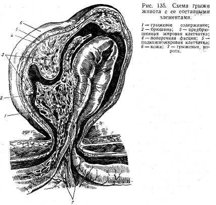 Пороки развития брюшной стенки и пупка Пороки развития брюшной стенки и пупка возникают из-за нарушения эмбриогенеза. В норме полость целома вначале простирается на расширенное основание пупочного канатика. Этот карман содержит петли кишок и другие органы брюшной полости, что объясняется более быстрым ростом этих органов, которые опережают развитие самой брюшной стенки и полости. Последняя начинает расширяться после 10-й недели эмбрионального развития, после чего органы перемещаются в нее. Однако в некоторых случаях развитие брюшной стенки запаздывает, и ребенок рождается с дефектом мышц живота или эмбриональной грыжей пупочного канатика. Врожденный дефект мышц живота. Относится к редким аномалиям развития и часто комбинируется с другими пороками развития кишечника и мочеполовой системы. Наблюдается в основном у мальчиков. Диагностика не сложна. При сохранившейся коже можно определить дефект в подлежащих тканях брюшной стенки. Через этот дефект хорошо пальпируются внутренние органы. Лечение. Показано пластическое закрытие дефекта. Используют аллопластический материал или излишки собственной кожи, которую иссекают после предварительного соскабливания эпидермиса, затем вшивают в дефект наружной стороной внутрь, анад ней зашивают свободные концы кожи (операция Ровиралета). Эмбриональная грыжа пупочного канатика. Это врожденный дефект брюшной стенки в области пупка с выпячиванием внутренних органов, покрытых беловатой прозрачной оболочкой (амнион). Эмбриональные грыжи часто сочетаются с другими аномалиями органов брюшной полости: недоразвитием кишечника, неправильным его положением. Лечение. Показано оперативное лечение в первые часы после рождения. Амниотическую оболочку иссекают, получившийся дефект ушивают при помощи местных тканей. В случае невозможности закрыть большой дефект местными тканями рекомендуется его края подшить к печени, а впоследствии на незакрытый участок печени пересадить свободный участок кожи. Грыжами живота называют выхождение внутренних органов вместе с париетальной брюшиной через различные отверстия брюшной стенки, таза, диафрагмы. При выхождении органов через брюшную стенку или таз грыжи именуют наружными, через диафрагму или складки брюшины — внутренними. В зависимости от локализации наружные грыжи делят на паховые, бедренные, пупочные, белой линии живота, запирательные, седалищные и др. Внутренние грыжи бывают диафрагмальные, отверстия Винслоу и др. Различают: 1) грыжевые ворота — отверстие, через которое выходит грыжевое содержимое; 2) грыжевой мешок — часть париетальной брюшины, которая выпячивается через грыжевые ворота и покрывает внутренние органы; 3) содержимое грыжевого мешка — наиболее часто петли тонкой кишки и сальник (рис. 135). Клиническая картина. Определяется опухолевидное образование в области выхождения грыжи (паховый и бедренный каналы, пупок и т.д.). В положении лежа это выпячивание может исчезнуть. Если грыжевое содержимое в положении лежа не исчезает и не удается вправить его рукой, тогда говорят о невправимой грыже. При наложении ладони на грыжевое выпячивание и покашливании кашлевой толчок передается на ладонь. При перкуссии может наблюдаться тимпанический (петли кишечника) или тупой (сальник) звук. При внутренних грыжах клиническая картина в осно