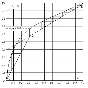 Відкладемо на осі ординат 0,393 і нанесемо робочу лінію АВ для верхньої частини колони. Через точки А і С проводимо робочу лінію для нижньої частини колони. Виконуючи на діаграмі побудову ламаної лінії (починаючи від точки В), знаходимо необхідну кількість ступенів зміни концентрації: у верхній частині колони вона становить 7, у нижній – 4; разом – 11.
