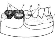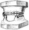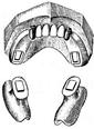 спаянные коронки (1) с втулками (2), овальной, трех- или четырехгранной формы; аналогичная втулка (3), закрепленная в съемной части протеза (4); фиксирующий стержень (5); петлевидный кламмер (6). Показания к применению: применяется в качестве формирующего при реконструктивных операциях мягких тканей подбородочного отдела и нижней губы и при костной пластике. При остеопластике для фиксации костного трансплантата также используют аппараты: шина Ванкевич; шина Ванкевич в модификации Степанова; проволочные шины с зацепными петлями на верхнюю челюсть, коронки, каппы с зацепными крючками на зубы отломков нижней челюсти с наложенной межчелюстной резиновой тягой; лигатурная межчелюстная проволочная фиксация; фиксирующий аппарат Бетельмана; аппараты с внеротовой фиксацией отломков.