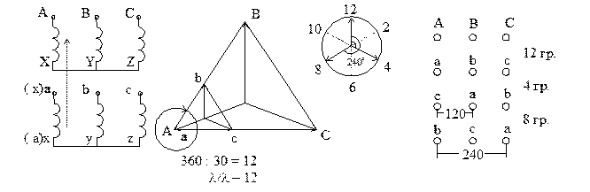 Группой соединения трансформатора называется угол сдвига между линейными ЭДС первичной и вторичной обмоток трансформатора. За первичную обмотку принимают обмотку высокого напряжения. Группа соединения зависит от: 1) от направления намотки; 2) маркировки концов обмотки; 3) схемы соединения обмоток. Группы соединения трехфазных трансформаторов: