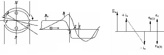 Рис. 248 Рис. 249 Рис. 250 Если щетки установлены на геометрической нейтрали, то секция, подойдя к пластине (1), начнет коммутировать. От скорости изменения т ока в секции в ней наведется реактивная ЭДС. Кроме того, секция коммутирует во внешнем поле той же полярности. Поэтому в секции наведется ЭДС ek того же знака, что и ЭДС er. Если щетки сдвинуть на физическую нейтраль, то секция начнет коммутировать, подойдя к пластине (2), и в ней наведется ЭДС er, а ЭДС ek будет равна нулю, т.к. индукция B в точке 2 равна нулю. Затем, если сдвинуть щетки за физическую нейтраль, то секция начнет коммутировать, дойдя до пластины (3), и в ней появится ЭДС er, а индукция B в этом положении будет иметь противоположный характер, и наводимая ЭДС ek будет противоположна ЭДС er. Сдвинув щетки на соответствующий угол, можно получить полную компенсацию er и ek и тем самым свести ток iдоб =0 и привести коммутацию к прямолинейной. Этот способ улучшения коммутации применим только тогда, когда нагрузка генератора практически постоянная. В практике нагрузка, как правило, переменная. Поэтому для улучшения коммутации используют второй способ.