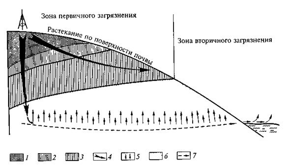 Рис 16 3 Модель загрязнения сырой нефтью (по Н.П.Солнцевой, упрощено): зоны загрязнения 1 — преимущественного осаждения тяжелых фракций нефти, 2 — преимущественного осаждения легких фракций, 3 — преимущественного накопления минерализованных вод и легких фракций нефти, 4 — направления миграции нефти, 5 — поступление нефти с пленки на поверхности грунтовых вод, 6 — зона вторичного загрязнения над уровнем грунтовых вод, 7 — уровень грунтовых вод