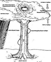 Рис. 4.1. Схема утворення смерчу. Смерч спричиняє * нищення будівель, * пожежі, * руйнування різноманітної техніки, *вихрові рухи повітряних потоків смерчу здатні піднімати машини, потяги, мости тощо. І водночас смерчі здатні на дивні речі. В одному місці вихор підняв у повітря будинок з трьома його мешканцями, повернув його на 360° і опустив на землю без жодного ушкодження. Трапляються смерчі і в Україні, південні смерчі спостерігаються на Чорному та Азовському морях. Аналогічно ураганам смерчі спочатку розпізнають з космічних метеорологічних супутників погоди, а потім за допомогою зйомок прослідкують їх розвиток та рух. ► отримавши повідомлення про ураган, необхідно щільно зачинити двері, вікна; ► з дахів та балконів забрати предмети, які при падінні можуть травмувати людину; ► в будівлях необхідно триматися подалі від вікон, щоб не отримати травми від осколків розбитого скла; ► найбезпечнішими місцями під час урагану є підвали, сховища, метро та внутрішні приміщення перших поверхів цегляних будинків; ► коли ураган застав людину на відкритій місцевості, найкраще знайти укриття в западині (ямі, яру, канаві); ► ураган може супроводжуватись грозою, необхідно уникати ситуацій, при яких збільшується ймовірність ураження блискавкою: не стояти під окремими деревами, не підходити до ліній електропередач тощо. *Пожежі. Причинами виникнення пожеж є недбала поведінка людей з вогнем, порушення правил пожежної безпеки, природні явища (блискавка, посуха). Відомо, що 90% пожеж виникає з вини людини і тільки 7-8% спричинені блискавками. *Пожежі — це неконтрольований процес горіння, який викликає загибель людей та нищення матеріальних цінностей. Під час пожеж вигорає родючий шар грунту, який утворювався протягом тисячоліть. Після пожеж у гірських районах розвиваються ерозійну процеси, а в північних — відбувається заболоченість лісових земель. Основними видами пожеж як стихійних лих, які охоплюють вели* території (сотні, тисячі, мільйони гектарів), є ландшафтні пожежі лісові і степові. Лісові пожежі поділяють на низові, верхові, підземні. За інтенсивністю горіння лісові пожежі поділяються на слабкі, середні, сильні.