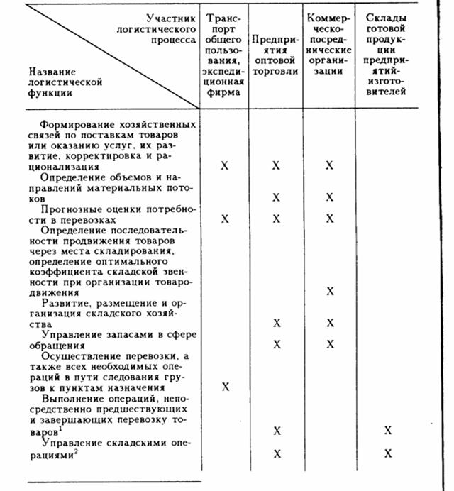 У таблиці. 4.1 дається перелік основних логістичних функцій і їх зразковий розподіл між різними учасниками логістичного процесу. Кожна з цих функцій є досить однорідною(з точки зору мети) сукупністю дій. Наприклад, кінцевою метою усіх заходів по формуванню господарських зв'язків є встановлення стосунків ділового партнерства між різними учасниками логістичного процесу, т. е. формування зв'язків між елементами макрологистнческих систем.