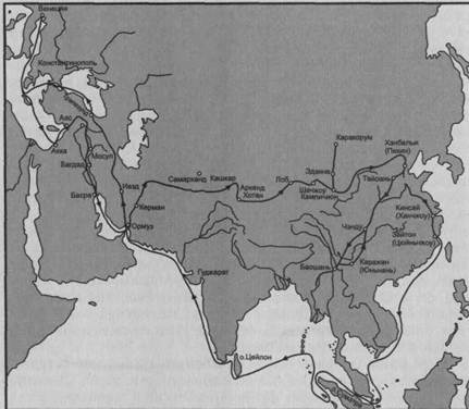 Рис. 2.2. Карта путешествия Марко Поло вение папы Григория X, который предложил им в спутники, а также для разведывательных и миссионерских целей двух монахов. Но, добравшись до Акры, где была крайне неспокойная политическая ситуация, монахи решили не искушать судьбу. Они передали папские подарки и письма семье Поло, а сами отправились в обратный путь. Братья Поло совершали повторное путешествие, незадолго до этого они вернулись из пятнадцатилетнего странствия в Китай. Теперь они продвигались уже знакомой дорогой. Из Киликии (Малой Армении) они через Анатолию прибывают к подножию горы Арарат. Через Мосул, Тебриз купцы пробираются к торговым городам Ирана, а потом выходят к Ормузу, откуда хотели морским путем добраться до Китая. Но, передумав, они решили через Памир сухопутным путем достичь границ Поднебесной империи. После долгих приключений они добрались до столицы хана Хубилая. Хубилай решил испытать Марко Поло в качестве посла и отправил в отдаленный город Караджан. Результаты посольства были, по всей вероятности, столь блистательны, что Хубилай целых семнадцать лет удерживал венецианца у себя на службе. Возвращались они на родину морем: вокруг Южной Азии и через Иран. Но даже на обратном пути они выполняли государственное задание хана: сопровождали двух царевен, которых выдавали замуж за монгольского правителя Ирана (ильхана) и его наследника. Флотилия, выйдя из Южно-Китайского моря, заходила на Суматру, Яву, Цейлон. Оттуда они прошли вдоль западного берега Индии и южного побережья Ирана до Персидского залива. Доставив царевен в Иран, они только после этого смогли благополучно вернуться домой. Свои воспоминания, названные «Книгой», Марко Поло продиктовал в генуэзской тюрьме, где ненадолго оказался после участия в военных действиях против Генуэзской республики. Его «Книга» послужила ценным руководством для картографов XIV—XV вв. Организаторы португальских экспедиций в Вест-Индию пользовались картами, основанными на данных, изложенных Марко Поло. Она была настольной книгой многих мореплавателей и первооткрывателей, в том числе и Христофора Колумба. Нельзя забывать, что Марко Поло был купцом, поэтому его книга представляет один из первых образчиков того, что можно было бы назвать пособием по экономической географии. Ничего удивительного, что многие аспекты жизни китайцев не вошли в круг интересов знаменитого венецианца, тем более что Марко Поло не знал китайского языка, да и не все, что видел, считал необходимым отражать в своем произведении. Но некоторая недоговоренность, неосвещенность таких вопросов, как, например, потребление и торговля чаем, одним из основных экспортных товаров Китая, привела к крайним суждениям части исследователей. Некоторые из них стали полагать, что Марко Поло никогда не был в Китае, а его книга — плод фантазии. Вряд ли купцу была под силу столь грандиозная мистификация. Да и в чем была ее необходимость? Известно, что Марко Поло был мало образован, а для того, чтобы собрать и обобщить огромный фактологический материал, приводимый в его «Книге», надо было проработать очень большое количество письменных источников. Это было просто невозможно из-за образовательного ценза венецианца, из-за трудности в добывании подобных материалов, да и из-за дефицита времени — ведь нельзя забывать, что главным ег