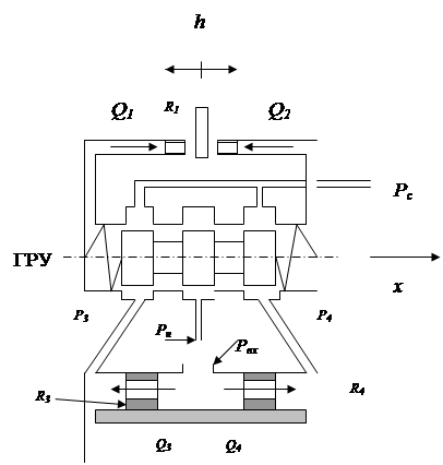 ГУ состоит из 4-х гидравлических сопротивлений R1, R2, R3, и R4. Эти гидравлические сопротивления соединены в схему моста. В одну диагональ моста подводится гидравлическое питание Рвх, в другую диагональ моста включается золотник, управляющий расходом жидкости в полости ГД. Гидравлические сопротивления R1 и R2 переменны и образуются зазором между соплами и заслонкой. При среднем положении заслонки h=h0 давления Р3 и Р4 равны друг другу и золотник под действием пружин с1 и с2 находится в среднем положении. Отклонение заслонки h нарушает равновесие сил на золотнике и под действием силы F=(Р3 - Р4)AЗ осуществляется его перемещение (АЗ – площадь торца золотника) пропорционально перемещению заслонки х. Максимальное перемещение заслонки hm связано с диаметром сопла hm£ 0,25dc. Максимальное перемещение золотника определяется величиной щелей золотника, которые выбирают исходя из потребных расходов для обеспечения заданных скоростей перемещения поршня ГРП. Под уравнением ГУ будем понимать зависимость x=f(h). Исходными для вывода этого уравнения являются: - уравнения неразрывности потоков жидкости; - уравнения сил, приложенных к золотнику. Считаем схему моста симметричной. Расход жидкости через сопло 1 можно записать на основании уравнения расхода через элементарный дроссель (при условии Рсл=0):