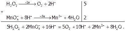 Реакции, идущие с изменением ст.ок. элементов, называются окислительно-восстановительными (ОВР) или редокс - процессами [8]. Причем вещество, отдающее электроны, является восстановителем, а принимающее их – окислителем. Окислители и восстановители. Редокс-свойства соединений определяются положением их элементов в таблице Менделеева. Так, типичные окислители: а) простые вещества, атомы которых имеют высокую ЭО (F2, O2, Cl2 и др.); б) сложные соединения, содержащие катионы металлов в сравнительно высоких неустойчивых ст.ок. ( в) вещества, в которые входят сложные анионы с центральным атомом в высокой неустойчивой ст.ок. ( г) пероксидные соединения: пероксид водорода ( К типичным восстановителям относятся: а) простые вещества, атомы которых характеризуются низкой ЭО (щелочные металлы (ЩМ), щелочноземельные металлы (ЩЗМ), алюминий, цинк). б) сложные соединения, содержащие элементы в низких неустойчивых ст.ок. (в качестве катионов: Однако деление веществ на окислители и восстановители относительно, поскольку в зависимости от условий большинство их проявляют и окислительные, и восстановительные свойства. Чаще это наблюдается в случае соединений, содержащих элементы в промежуточной ст.ок. Так, типичный окислитель Н2О2 восстанавливает перманганат калия в кислой среде: