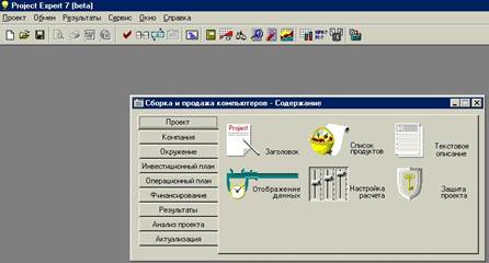 После открытия какого-либо файла проекта основное меню Project Expert состоит из пунктов: