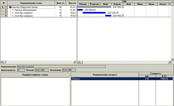 Модуль "Календарный план" предназначен для: - составления календарного плана проекта; - описания отдельных этапов проекта с назначением необходимых ресурсов для их выполнения; - формирования активов проекта из отдельных этапов; - выбора сроков и способа амортизации активов; - описания активов действующего предприятия; - построения диаграммы ГАНТТ; - формирования годового календаря. ► В нашем проекте заполняем Название этапа Длительность Дата начала Дата окончания закупка сборочной линии 89 01.01.1998 30.03.1998 закупка оборудования 15 01.01.1998 15.01.1998 этап без названия 59 16.01.1998 15.03.1998 этап без названия 16 15.03.1998 30.03.1998