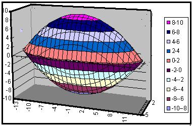 Виділимо цю клітинку і встановимо вказівник миші на її маркері заповнення та протягнемо його так, щоб заповнити діапазон B14: L24. Знак $, що стоїть перед буквою в імені комірки, дає абсолютне посилання на стовпець з даним ім'ям, а знак $, що стоїть перед цифрою - абсолютне посилання на рядок з цим номером. Тому при протягуванні формули з комірки В14 в комірки діапазону B14:L24 в них буде знайдено значення Отже, таблиця значень функції при різних значеннях змінних створена. . Завдання 2. Побудувати поверхню, Оскільки вигляд функції залежить від деяких умов, використаємо логічну функцію ЕСЛИ. Формула для розрахунку в комірці В2 (якщо розрахунки виконуються на новому листі!) має наступний вигляд: = ЕСЛИ(ABS(A2+B1)<0,5;2*A2^2-EXP(B1);ЕСЛИ(ABS(A2+B1)<1;A2*EXP(2*A2)-B1;2*EXP(A2)-B1*EXP(B1))) УВАГА! Для протягування формули на весь діапазон табуляції встановлюємо в формулі абсолютні посилання на строку і стовбець як в Завданні 1. Варіанти для самостійної роботи 1. Обов’язкові завдання для всіх курсантів. а). Побудувати зображення тривимірної функції (еліпсоїд), в діапазоні X від -13 до 13, Y від –5 до 5 з кроком 1 та визначається рівнянням