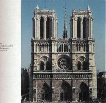 Витражи церкви Сент-Шапель, Париж 1248 в пучки стеблей вокруг столбов. Даже оконные проемы затягиваются плетениями ажурных решеток (илл. 124). Громадные кафедральные соборы, то есть главные церкви епархии (слово «кафедра» означает «епископский трон») конца XII-первой половины XIII веков замышлялись с таким размахом, что лишь немногие из них были завершены в соответствии с первоначальным планом. Но даже в таком виде, с многочисленными привнесенными временем изменениями, их интерьеры оставляют неизгладимое впечатление размахом пространств, возносящихся над малыми земными существами. Можно представить себе, какое воздействие оказывали эти сооружения на людей, привыкших к мрачной тяжеловесности романских церквей. В мощи романских строений воплотилась идея Церкви воинствующей, ограждающей людей от разгула греха. Новые соборы несли верующим видение иного мира. В проповедях и гимнах того времени воспевались жемчужные врата Небесного Иерусалима, драгоценные украшения его стен, улицы из чистого золота и прозрачного стекла (Откр. 21). Теперь видение спустилось с небес на землю. В этих творениях уже не было суровой неприступности. Вместо стен - стеклянные поверхности, сверкавшие рубиновыми и изумрудными цветами. В пилонах, нервюрах и каменных кружевах мерцало золото. Исчезло все, что напоминало о земной тяжести или ее тяготах. Верующим, предававшимся созерцанию этой красоты, чудилось, что они, преодолев материю, возносятся к таинственным высотам потустороннего мира. Даже издали казалось, что эти чудесные сооружения славят небеса. Пожалуй, самое совершенное из них - собор Парижской Богоматери (илл. 125). Углубления порталов, просветы окон прорезают массу фасада с такой легкостью, а кружево галереи так тонко и прозрачно, что каменная громада кажется невесомой, парящей как зыбкий мираж.