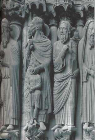Фланкирующие портал статуарные группы производят сходное впечатление бесплотного небесного воинства. Если романский мастер из Арля (стр. 176, илл. 115) прочно вписал фигуры святых в архитектурное обрамление, уподобив их вертикальным пилонам, то скульптор, работавший над северным порталом готического собора в Шартре (илл. 126, 127), стремился придать своим статуям дыхание жизни. Они словно движутся, общаются друг с другом, а ниспадающие драпировки обрисовывают формы тела. Каждый, кто знаком с Библией, легко узнает в них героев ветхозаветной истории. Так, нетрудно опознать старика Авраама с его сыном Исааком, предназначенным на жертвоприношение, и Моисея - по скрижалям с десятью заповедями и по колонне с медным змием, исцелявшим израильтян. По другую сторону от Авраама стоит Мелхиседек, царь Салимский, которого Библия (Быт. 14: 18) называет «священником Бога Всевышнего»: когда Авраам одержал победу в битве, он «вынес хлеб и вино» и благословил победителя. Для средневековых теологов Мелхиседек был первообразом священника, совершающего таинство евхаристии, поэтому он изображен с потиром и кадилом. В готических соборах почти каждая из фигур портала обозначается определенной эмблемой, так что прихожане без труда различали их. Скульптурный ансамбль всего собора охватывает церковное учение с большой полнотой, и в этом нет отличия от соборной пластики романского периода. И все же готический мастер иначе подходит к своей задаче. Для него статуи - не только священные символы, утверждающие истины веры и наставляющие в добродетели. Каждая фигура обладает самостоятельным значением, отличаясь от соседней позой и чертами лица, каждая наделена особым характером.