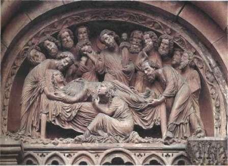 Южный портал трансепта собора в Страсбурге В этом можно убедиться на примере тимпана готического собора в Страсбурге, выстроенного в XIII веке (илл. 129). В нем представлен сюжет смерти Марии. Ее ложе окружают фигуры двенадцати апостолов и коленопреклоненной Марии Магдалины. Христос в центре композиции принимает душу усопшей. Художник еще не вполне распростился с торжественной симметрией романского искусства. Видимо, он делал предварительные эскизы, чтобы вписать головы апостолов в полукружие арки, поместить фигуру Христа точно в центре, найти соответствие между двумя апостолами, склонившимися над ложем. Но его явно не удовлетворяла чистая симметрия, столь характерная для мастеров XII века (стр. 181, илл. 120). Он определенно стремился вдохнуть жизнь в свои фигуры. На красивых лицах апостолов, в их приподнятых бровях и напряженных взглядах запечатлелась скорбь. Трое поднесли ладонь к щеке в традиционном жесте печали. Еще выразительнее поза Марии Магдалины, скорчившейся и в отчаянии заломившей руки; ее горестное лицо контрастирует с блаженной отрешенностью лица Марии. Драпировки уже не имеют ничего общего ни с пустыми оболочками, ни с орнаментальными завитками раннего средневекового искусства. Готические художники стремились постичь секреты античной драпировки, раскрыть реальное содержание унаследованной формулы. На территории Франции они могли видеть остатки древних статуй, римские надгробия и триумфальные арки. Им удалось возродить утраченное было искусство выявления телесных объемов под складками тканей. Наш художник по праву мог гордиться своими успехами. Мастерство прорисовки выступающих под облачениями рук и ног Богоматери, правой руки Христа убеждает в том, что готических скульпторов интересовал не только предмет изображения, но и способ его передачи. Они вновь, как когда-то ваятели Древней Греции, обратили взгляд на природу, но не для того, чтобы скопировать ее, а чтобы найти надежные приемы выразительной проработки фигуры. Есть, однако, и огромная разница между греческим и готическим искусством, искусством языческих храмов и искусством соборов. Греческий художник V века до н.э. был увлечен строением прекрасного тела. У готического мастера все пластические завоевания служили иной цели -представить эпизод священной истории с максимальной наглядностью и эмоциональной выразительностью. Он пересказывает сюжет не ради него самого, а ради заключенного в нем содержания, ради утешения и наставления верующих. Поза и жест Христа, его взгляд, обращенный к умирающей Марии, для него гораздо важнее, чем искусно переданная игра мускулатуры. Некоторые художники XIII столетия в своем намерении одушевить камень продвинулись еще дальше. Скульптору, исполнявшему заказ на статуи донаторов (дарителей) в соборе в Наумбурге (Германия, около 1260 года), удалось создать впечатление, что перед нами — настоящие