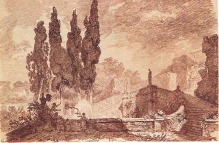 310 показан рисунок Жана Оноре Фрагонара (1732 - 1806), современника Гейнсборо. В своих картинах на галантные темы Фрагонар продолжал, и с большим изяществом, линию Ватто. Его пейзажные зарисовки наполнены особой экспрессией. Реальный вид с террасы виллы д'Эсте в Тиволи, близ Рима, преображен художником в величественное и поэтическое зрелище.