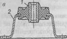 Рис. 2.15. Конструкції віброізоляторів для механічного устаткування Основною частиною ізолятора (рис. 2.15, а) є пружина 3, що спирається на гумову прокладку 1. Пружина і прокладка розміщені у металевому стакані 2. Для запобігання ударам за дуже великої амплітуди коливань передбачені обмежувачі 4 і 5. Гумове кільце 4 запобігає також ударам металу об метал при бокових вібраціях. Опірна конструкція 7 використовується для кріплення віброізолятора до основи. Установка, що ізолюється, кріпиться до ізолятора за допомогою болта 6. Пружина 3 слугує для ізоляції коливань низьких частот, а гумова прокладка 1 - високих. Крім того, ця прокладка внаслідок великих внутрішніх втрат у гумі збільшує тертя. Досить простий за конструкцією віброізолятора (мал. 2.15, б), що являє собою гумовий брусок 2, розміщений між металевими пластинами 1 та 3, які можуть бути приклеєні до бруска. Висоту Н вибирають за величиною потрібного статичного стиску з урахуванням забезпечення стійкості та міцності гумового бруска, а розмір 1, визначають виходячи з допустимого навантаження па один віброізолятор. В міру збільшення розміру 1 порівняно з Н швидко зростає жорсткість віброізолятора, тому що при деформації обсяг гуми майже не змінюється, і необхідно забезпечити її бокове розширення при повздовжньому стисканні. З тієї ж причини неефективні віброізолятори, які складаються з суцільних тонких гумових листів. Замість них краще використовувати гумові килимки з гофрованої гуми, що випускаються промисловістю. Гумові та гумово-металеві віброізолятори мають багато модифікацій, де використовується властивість гуми добре приклеюватися при вулканізації до металу. На рис. 2.15, в, зображено чашковий віброізолятор, якій складається із гумової втулки 1, укріпленої на металевому держаку 2. Цей віброізолятор використовують у приладах. Перевагами гумових віброізоляторів є простота конструкції та невисока вартість, а недоліками - швидке старіння гуми, руйнування її нафтопродуктами, важкість конструювання для ізоляції від низькочастотних вібрацій. У ряді випадків добрий ефект дає застосування пневматичних або гідравлічних віброізоляторів. Ефективність віброізоляції залежить від відношення частоти збудження (г3) та власної частоти(і0) коливань системи. Віброізолятори знижують передачу динамічних сил на об'єкт, що захищається, за умови: (г3Д0) > >/2. Коефіцієнт передачі (КП), яка вказує на співвідношення сили діючої на об'єкт у разі існування гнучкого зв'язку (віброізолятора) і без нього, при гармонійних коливаннях визначається виразом: КП = 1/[(і;Д)2 - 1] (2.45) Оптимальна віброізоляція досягається при КП=1/8...1/15. Віброізоляцію людини забезпечують за допомогою віброзахисних крісел, віброізоляційних кабін та платформ. Одна з конструкцій віброзахисного крісла показана на рис. 2.16. Для захисту від низькочастотних вібрацій використовують пружини 4, які забезпечують необхідну величину статичного стискання та низьку власну частоту системи. Амортизатор 1 вносить тертя у коливальну систему і пом'якшує передачу поштовхів та ударів завдяки забезпеченню в ньому нелінійної залежності сили тертя від швидкості деформації. Для забезпечення комфорту та захисту людини від високочастотної вібрації застосовується м'яке сидіння 2 та спинка 3. Ефективною додатковою мірою захисту, наприклад трактористів, є вібро