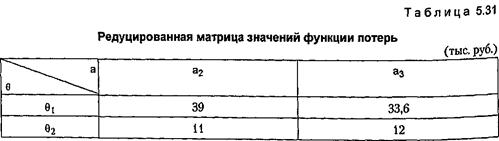 Анализируя значения функции потерь как элементы матрицы исходной стратегической игры (Q, A, L), можно заметить, что решения ajи ац доминируют-ся решением аз, т.е. потери при стратегии аз явно меньше, чем при стратегиях ai и а4. Учитывая ранее изложенные принципы стратегических игр, эти доминирующие стратегии 2-го игрока можно не принимать во внимание и вычеркнуть первый и четвертый столбцы матрицы. Вычеркнув доминирующие решения, соответствующие сезонному снижению цен на 20% и 50%, получим новую матрицу значений функций потерь (табл. 5.31).