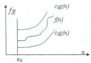 f(n) =Θ(g(n)), если существуют положительные c1, с2, n0, такие, что: cl ·g(n) =< f(n) =< c2 * g(n), при n > n0 Обычно говорят, что при этом функция g(n) является асимптотически точной оценкой функции f(n), т.к. по определению функция f(n) не отличается от функции g(n) с точностью до постоянного множителя. Отметим, что из f(n) = Θ(g(n)) следует, что g(n) = Θ(f(n)). Примеры: 1) f(n)=4n2+nlnN+174 - f(n)= Θ (n2); 2) f(n)=Θ(l) - запись означает, что f(n) или равна константе, не равной нулю, или f(n) ограничена константой на : f(n) = 7+1/n = Θ(1). 2. Оценка О ( О большое) В отличие от оценки Θ, оценка О требует только, что бы функция f(n) не превышала g(n) начиная с n > n0, с точностью до постоянного множителя: