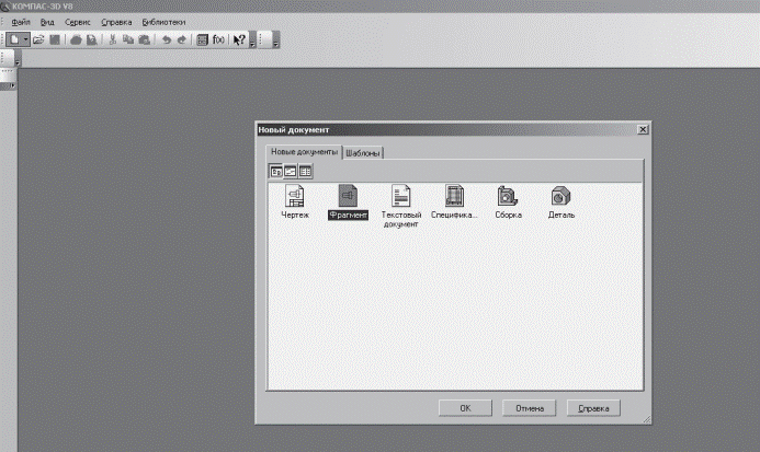 В КОМПАС имеются несколько типов документов: одни относятся к чертежам, другие к трехмерному моделированию, а третьи к текстовым. Каждому типу документа соответствует файл с определенным расширением. Для того чтобы создать новый документ, на инструментальной панели Стандартная щелкните левой клавишей мыши по кнопке Создать Даная система позволяет создавать: 1. чертеж – изображение с рамкой и штампом (файлы чертежей имеют расширение.cdw); 2. фрагмент – вспомогательный документ без рамки и штампа (файл фрагмента имеет расширение.frw); 3. текстовый документ – это любой документ, содержащий текст (файл текстового документа имеет расширение.kdw); 4. спецификация – это документ, оформленный в виде таблицы в рамке с основной надписью, который содержит информацию о деталях сборки (файл спецификации имеет расширение.spw); 5. сборка – это модель, созданная из различных деталей с при 6. деталь – это модель, созданная из однородного материала без применения сборочных операций (файл детали имеет расширение.m3d).