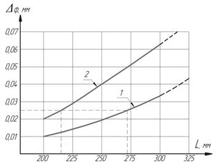 Рисунок 5.2 – Расчетные зависимости Δφ=φ(L): 1 – установка в патроне и заднем центре; 2 – установка в центрах Контрольные вопросы 1. Как рассчитывается ожидаемая погрешность формы Δф при различных способах установки валов? 2. Какие параметры конструкции детали влияют на погрешность Δф? 3. Какой параметр V, S или t в наибольшей мере влияет на образование погрешности Δф? 4. Если приз заданном способе установки исчерпаны возможности обеспечения требования Δф < [Δф] за счет подбора S, V и параметров геометрии инструмента, то как можно обеспечить [Δф]? 5. С помощью каких приспособлений и схем резания можно уменьшить Δф при обработке валов и осей? 6. Можно ли за счет увеличения числа проходов обеспечить уменьшение значения Δф?