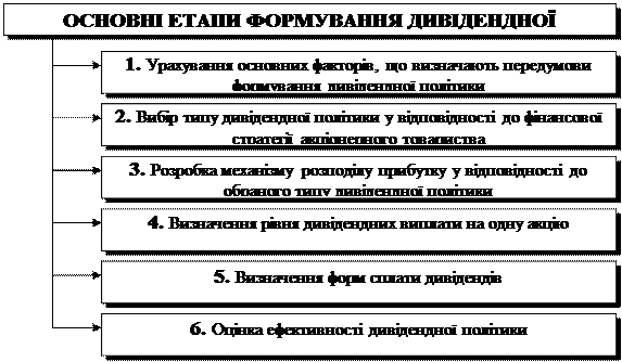 З урахуванням розглянутих принципів дивідендна політика акціонерного товариства формується за наступними основними етапами (рис. 7.2). Важливим етапом формування дивідендної політики є вибір форм сплати дивідендів. Основними з таких форм є: 1. Сплата дивідендів готівковим грошима (чеками). Це найбільш проста і розповсюджена форма здійснення дивідендних виплат. 2. Сплата дивідендів акціями. Така форма передбачає надання акціонерам знов емітованих акцій на суму дивідендних виплат. Вона представляє інтерес для акціонерів, менталітет яких орієнтований на зростання капіталу в майбутньому періоді. 3. Автоматичне реінвестування. Ця форма сплати надає акціонерам право індивідуального вибору – отримати дивіденди готівкою, або реінвестувати їх у додаткові акції (у цьому випадку акціонер укладає з компанією або обслуговуючою її брокерською конторою відповідну угоду). 4. Викуп акцій компанією. Розглядається як одна з форм реінвестування дивідендів, у відповідності до якої на суму дивідендного фонду компанія скуповує на фондовому ринку частину акцій, що вільно обертаються. Така форма використання дивідендів вимагає згоди акціонерів.