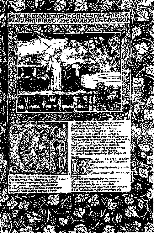 У. Моррис. Оформление книги «Сочинения Чосера» Близок по взглядам к Рёскину был в 60—70-е годы и Уильям Моррис (1834—1896) — выдающийся поэт, художник, а впоследствии — деятель социалистического движения. Выходец из буржуазной семьи, студент Оксфордского университета, восторженный почитатель и младший друг Россетти, поклонник средневековой готики, Моррис примкнул к прерафаэлитам и в литературном творчестве 50—70-х годов не выходил за рамки стилизованной поэзии на средневековые сюжеты. Однако подход к труду как к творчеству, взгляд на красоту как на категорию не только эстетическую, но и нравственную уже в те годы сближали Морриса с Рёскиным и начинали отдалять от прерафаэлитов.
