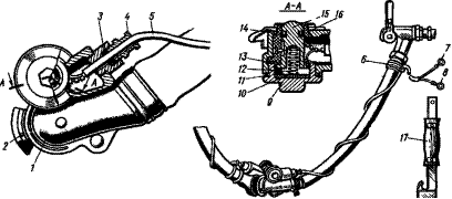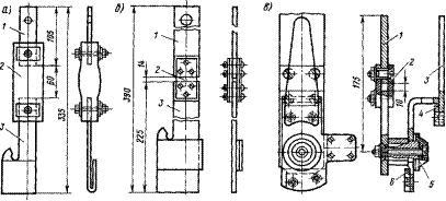 1. Устройство междувагонного соединения усл. № 369А. (стр. 194-196) Междувагонное соединение № 369А. (рис. 165) В корпусе чугунной головки 1 рукава междувагонного соединения имеется прилив для подвижного контакта, состоящего из пальца 15 с резиновой манжетой 14 и пружиной 12, и изоляционной втулки 16. Резьбовое отверстие прилива закрыто крышкой 9 с резиновым кольцом 11, а в углублении крышки находится изоляционная прокладка 10. Шланговый кабель 5 с двумя проводами 7 и 8 с разными диаметрами отверстий в наконечниках закреплен в головке 1 резиновым кольцом 3, стягиваемым штуцером 4, а со стороны наконечника — хомутиком 6. Провод с наконечником под болт диаметром 8 мм внутри головки присоединен к контактному пальцу 15, а в коробке зажимов — к рабочему проводу № 1. Второй провод с наконечником, имеющим отверстие под болт диаметром 6 мм, припаивают к контактному кольцу 13, а в коробке зажимов присоединяют к контрольному проводу № 2. При соединении головок 1 контактный палец 15, перемещаясь по втулке 16, отходит от контактного кольца 13, вследствие чего провода № 1 и № 2 размыкаются. В сцепленном положений головок / рабочие провода М 1 замыкаются через контактные пальцы 15, а контрольные провода №2 — непосредственно через корпуса головок и их гребни. Для лучшего контакта контрольного провода в гребень головки запрессована латунная заклепка 2 диаметром 3 мм, высотой 1,8 мм с полукруглой головкой. Усилие каждого контакта около 70 Н В разъединенной головке пружина 12 прижимает подвижной палец 15 к кольцу 13 и замыкает между собой провода № 1 и № 2. В хвостовом вагоне рукава подвешивают на изолированные подвески 17 для изоляции электрической цепи тормоза (головки) от кузова (заземления); при этом остаются замкнутыми провода №1 и № 2 (палец 15 выдвинут наружу). На локомотивах изолированная подвеска (рис. 166) состоит из планки 1, изоляционной вставки 2, накладок 4 и 5, ручки 3 и изоляционной фасонной шайбы 6. Подвеска обеспечивает изоляцию головки рукава № 369 от рамы (заземления) и размыкания линейных проводов между собой. Нижние планки вагонных и локомотивных подвесок покрывают электроизоляционной эмалью. При двух подвешенных рукавах на локомотиве сигнальная лампа гореть не будет. Резиновая трубка (ГОСТ 1335— 70) рукавов № 369А имеет сопротивление не менее 10 МОм при напряжении 1000 В. Электрическую часть рукава проверяют на замыкание контактов и отсутствие короткого замыкания при напряжении 36 В.