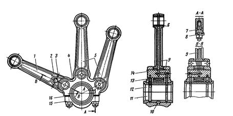 Узел шатунов (рис. 46)состоит из: главного (ведущего) шатуна 1, жестко связанного с головкой двумя пальцами, и двух прицепных 5 шатунов, соединенных пальцами 14, застопоренными винтами 13. Главный шатун выполнен из двух частей — собственно шатуна 1 и разъемной головки 4, жестко соединенных между собой пальцем 2 со штифтом 3 и пальцем 14. В головки шатунов запрессованы бронзовые втулки 6. Съемная крышка 15 прикреплена к головке четырьмя шпильками 7, гайки которых застопорены замковой шайбой 8. Тонкостенные стальные вкладыши 11 и 12, залитые баббитом, удерживаются в головке за счет натяга и стопорения штифтом 10. Зазор между шейкой вала и подшипником шатуна регулируют прокладками 16 (одна прокладка толщиной 0,7 мм и три по 0,1 мм). Каналы 9 служат для подачи смазки. Поршни 6 и 14 (см. рис. 44) (литые чугунные) присоединены к верхним головкам шатунов 16 поршневыми пальцами 15 плавающего типа. На каждом поршне установлены четыре поршневых кольца: два верхних — компрессионные, два нижних — маслосъемные, расположенные острыми кромками в сторону нижней части поршня. Кольца подвергают термообработке (твердость НВ 94 -7 -104). Внутренняя полость клапанной коробки 16 (рис. 47) разделена перегородкой на две камеры: нагнетательную Н, в которой расположен нагнетательный клапан 18, и всасывающую В со всасывающим клапаном 14. В клапанной коробке ЦНД со стороны камеры В прикреплен воздушный фильтр 3 (см. рис. 44), а со стороны камеры Н — холодильник 8. Нагнетательный клапан (см. рис. 47) установлен на прокладке и через упор 17 прижат винтом 2 с контргайкой 3 к гнезду в корпусе коробки. Разгрузочный механизм всасывающего клапана 14 состоит из упора 13, в который запрессованы три пальца, и стержня 11. Пружина 12 отжимает вверх упор 13, а пружина 10 — поршень 9. Направлением для упора 13 служит втулка, запрессованная в корпус зажимного стакана 6, а сверху крышкой 7 закреплена резиновая диафрагма 8. Крышка 1 и седла клапанов уплотнены паронитовыми прокладками 4 и 15, а фланец стакана 6 — асбестовым шнуром 5. Всасывающие и нагнетательные клапаны (рис. 48) состоят из седла 5 с проходным сечением 41,5 см2, обоймы 1, большой пластины 4 диаметром 108X81 мм, малой пластины 3 диаметром 68X40 мм, конических ленточных пружин 2 по три на каждую пластину, шпильки 7 и корончатой гайки 6. Пружины клапанов перед постановкой нужно проверить под нагрузкой при сжатии их до 8 мм. Пружины с большей жесткостью ставят на нагнетательные клапаны, а с меньшей —на всасывающие. Материал пластин — сталь 3X13 с твердостью HRC 46 - 52; толщина пластин 2 мм.
