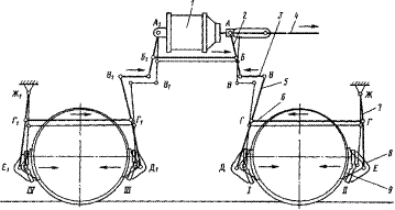 Тема №26 1. Назначение и устройство рычажной передачи локомотива. (стр.257 267 270) (при ручном торможении) или усилие, развиваемое сжатым воздухом, по штоку тормозного цилиндра (при пневматическом и электропневматическом торможениях) передается на тормозные колодки, которые прижимаются к колесам. По действию на колесо различают рычажные передачи с односторонним и двусторонним нажатием колодок. Рычажная тормозная передача с двусторонним нажатием колодок имеет следующие преимущества по сравнению с односторонним: колесная пара не подвергается выворачивающему действию в буксах в направлении силы нажатия колодок; давление на каждую колодку меньше, следовательно, меньше износ колодок; коэффициент трения между колодкой и колесом больше. Однако рычажная передача при двустороннем нажатии значительно сложнее по конструкции и тяжелее, чем при одностороннем, а температура нагрева колодок при торможении выше на 10—15%. С применением композиционных колодок недостатки одностороннего нажатия становятся менее ощутимыми вследствие меньшего нажатия на каждую колодку и более высокого коэффициента трения. В основном все грузовые вагоны имеют одностороннее нажатие колодок, а пассажирские вагоны —двустороннее, с вертикальными рычагами, расположенными с двух сторон колес. Поэтому на грузовых вагонах применяются триангели, а на пассажирских вагонах балки (траверсы). Тормозные рычажные передачи локомотивов имеют большое разнообразие схем в зависимости от числа тормозных цилиндров, их расположения и нажатия тормозных колодок. Современные электровозы имеют двустороннее нажатие тормозных колодок. На тепловозе 2ТЭ116 на каждое колесо действует свой тормозной цилиндр, на тепловозах ТЭЗ, 2ТЭ10Л, М62 и др. на каждую сторону тележки действует тормозной цилиндр На электровозах ВЛ22М, ВЛ23 и др. имеется по одному тормозному цилиндру с каждой стороны двухосной тележки. Многоцилиндровая система тормозной рычажной передачи уменьшает потери на трение и значительно упрощает конструкцию передачи. Такие передачи применяются на локомотивах, мотор-вагонном подвижном составе и вагонах с дисковым тормозом. Применять на вагонах многоцилиндровые системы нецелесообразно, так как потребуются гибкие соединения к тормозным цилиндрам от рамы вагона к тележкам и увеличивается количество автоматических регуляторов выхода штока (для каждого цилиндра). Устройство и принцип действия (рис. 224). Тормозные рычажные передачи состоят из следующих основных частей: горизонтальных 2 и вертикальных 5 рычагов, тяг 3, затяжек (распорок) 6, тяги 4 ручного тормоза, подвесок 7, башмаков 8 и колодок 9. В поперечном направлении башмаки 8 укреплены на триангелях или балках (на рис. 224 не показаны). Для предохранения от падения на путь частей рычажной передачи применяют предохранительные устройства (подвески, кронштейны, цепи и др.) Для лучшего уяснения принципа и последовательности действия рычажной передачи на рис. 224 рычаги правой колесной пары обозначены буквами, а левой — буквами с индексом. При поступлении воздуха в тормозной цилиндр 1 поршень со штоком перемещается вправо, при этом происходит следующее: горизонтальный рычаг Л В вращается в точке Б, перемещает тягу ВВ и поворачивает вертикальный рычаг ВД в точке Г. Нижний конец Д рычага прижимает триангель с башмаками 8 и колодкой 9 к к