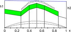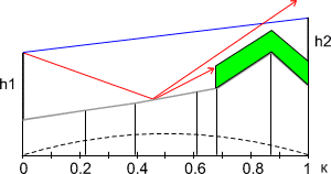 Рис. 4.3 На продольном профиле (рис. 4.3) антенные опоры установлены на возвышенных местах, что, на первый взгляд, выгодно так как позволяет получить большую величину просвета при малых высотах антенных опор. Однако на участках пролета с координатами k = 0.2 до 0.7 имеются плоские участки, от которых возможно появление отраженных волн, приводящих к интерференционным замираниям. Положение усугубляется тем, что в середине пролета находится водное пространство. Коэффициент отражения от поверхности воды достигает 1 (при отсутствии волнения) и энергия отраженной волны будет равна энергии прямой волны, что приведет к возможному падению мощности сигнала на входе приемника при интерференции до 0. Длительность интерференционных замираний составляет секунды и доли секунд. В цифровых системах связи интерференционные замирания определяют качественные параметры линии. Поэтому, выбирать пролеты с такими профилями нежелательно. Эти замечания не относятся к коротким пролетам, протяженностью несколько километров, так как отраженной волны может здесь не быть из-за направленных свойств антенных устройств. Например, такой пролет расчитывался для линии связи, проходящей через Северную Двину. Протяженность пролета составляет 4 км, величина просвета - 15 м, рабочая частота 11 ГГц, коэффициент усиления антенн 41 дБ. При этом радиус поперечного сечения электромагнитного луча, сформированного направленными свойствами антенны (диаграммой направленности), на середине пролета около 12 м (по уровню половинной мощности). Следовательно, в этих условиях появление отраженной волны невозможно и данная форма профиля вполне приемлема. При протяженности же пролета 20 км, радиус раскрыва диаграммы направленности антенны (на середине пролета) достигает величин в несколько десятков метров. Значит при такой форме пролета для устойчивой работы линии связи величина просвета должна превышать эти величины. Профиль пролета, показанный на рис. 4.4, содержит участок (k = 0.87) от которого возможно появление отраженной волны. Но форма препятствия такова, что отражение может произойти от одной точки, а не от какой-то поверхности. В этом случае уровень отраженной волны невелик, и замирания сигнала из-за интерференции не очень глубокие.