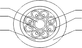 Рис. 11.7 Конструкция ОК-8 приведена на рисунке 1.7. Оптические волокна 1 (многомодовые, ступенчатые) свободно располагаются в полимерных трубках 2. Скрутка оптических волокон – повивная, концентрическая. В центре – силовой элемент 3 из высокопрочных полимерных нитей в пластмассовой трубке 4. Снаружи – полиэтиленовая лента 5 и оболочка 6. Кабель ОК-4 имеет принципиально те же конструкцию и размеры, но четыре ОВ в нем заменены пластмассовыми стержнями. Недостатки волоконно-оптической технологии: · Необходимы также оптические коннекторы (соединители) с малыми оптическими потерями и большим ресурсом на подключение-отключение. Точность изготовления таких элементов линии связи должна соответствовать длине волны излучения, то есть погрешности должны быть порядка доли микрона. Поэтому производство таких компонентов оптических линий связи дорогостоящее. · Другой недостаток заключается в том, что для монтажа оптических волокон требуется прецизионное, а потому дорогое, технологическое оборудование. · Как следствие, при аварии (обрыве) оптического кабеля затраты на восстановление выше, чем при работе с медными кабелями. Тем не менее, преимущества от применения волоконно-оптических линий связи (ВОЛС) настолько значительны, что, несмотря на перечисленные недостатки оптического волокна, эти линии связи все шире используются для передачи информации. Основная литература: 1осн[59-80, 638-655],