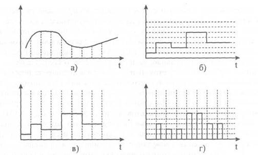 Дискретизация по времени, квантование по уровню. В системах электросвязи информация передается с помощью сигналов. Международный союз электросвязи дает следующее определение сигнала: Сигналом систем электросвязи называется совокупность электромагнитных волн, которая распространяется по одностороннему каналу передачи и предназначена для воздействия на приемное устройство. Из множества возможных физических параметров сигнала (например, амплитуда, фаза, частота колебания электромагнитной волны и т.д.) для отображения изменения передаваемого сообщения используется один или несколько параметров этого сигнала. Эти параметры называются представляющими. Характер изменения представляющих параметров сигнала во времени позволяют ввести следующие математические модели сигнала: 1) аналоговый сигнал - сигнал у которого каждый представляющий параметр задается функцией непрерывного времени с непрерывным множеством возможных значений (рис. 13.1а). Аналоговые сигналы широко применяются в телекоммуникациях. В телефонных сетях, например, это первичные сигналы, действующие в оконечных устройствах; 2) дискретный по уровню сигнал - сигнал, у которого значения представляющих параметров задается функцией непрерывного времени с конечным множеством возможных значений (рис. 13.1, б). Процесс дискретизации сигнала по уровню носит название квантования; 3) дискретный по времени сигнал- сигнал, у которого каждый представляющий параметр задается функцией дискретного времени с непрерывным множеством возможных значений (рис.13.1в). 4) В аналого-цифровом преобразовании такие сигналы используются при формировании отсчетов аналогового сигнала и, в этом случае, для краткости называются дискретными сигналами; цифровой сигнал - сигнал, у которого значения представляющих параметров задается функцией дискретного времени с конечным множеством возможных значений (рис. 13.1 г).